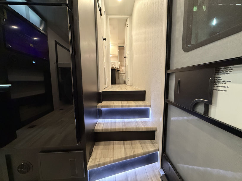 Enjoy pass-through exterior storage, a custom stair system with hidden storage, and a private upper-level bathroom. The main living area includes an entertainment center, front kitchen, versatile HappiJac bunk system, and a grooved sliding doors for overhead storage—sleek, stylish, and effortlessly smooth. Hide clutter while adding a modern touch.