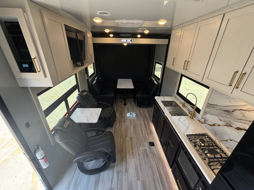 Introducing our all-new IROK FS LUXE Toy Hauler – Where rugged adventure meets refined comfort. Crafted for those who demand more from life on the road, this elite trailer features real lumber wood cabinetry, each piece hand-painted in a rich two-tone finish that brings a timeless elegance to your travels.