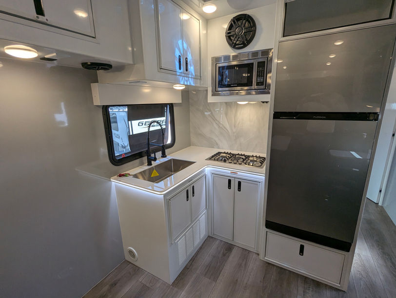 This slideout isn’t just about room to stretch—it transforms your toyhauler into a true home on wheels. Each slide includes a built-in entertainment system and extra cabinetry, giving you more storage, more convenience, and more ways to relax after a long day on the trails.