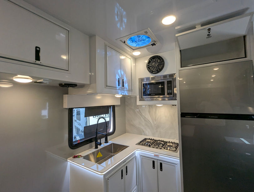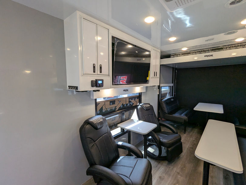 Introducing the ALL-NEW IROK FS Race Toy Hauler – engineered for performance, built to endure. Crafted with elite, premium materials, this trailer features aluminum-welded cabinetry for unmatched strength and longevity. The interior showcases fiberglass composite cabinet faces and seamless, aluminum-framed fiberglass walls—delivering a lightweight, modern finish without compromising durability.
